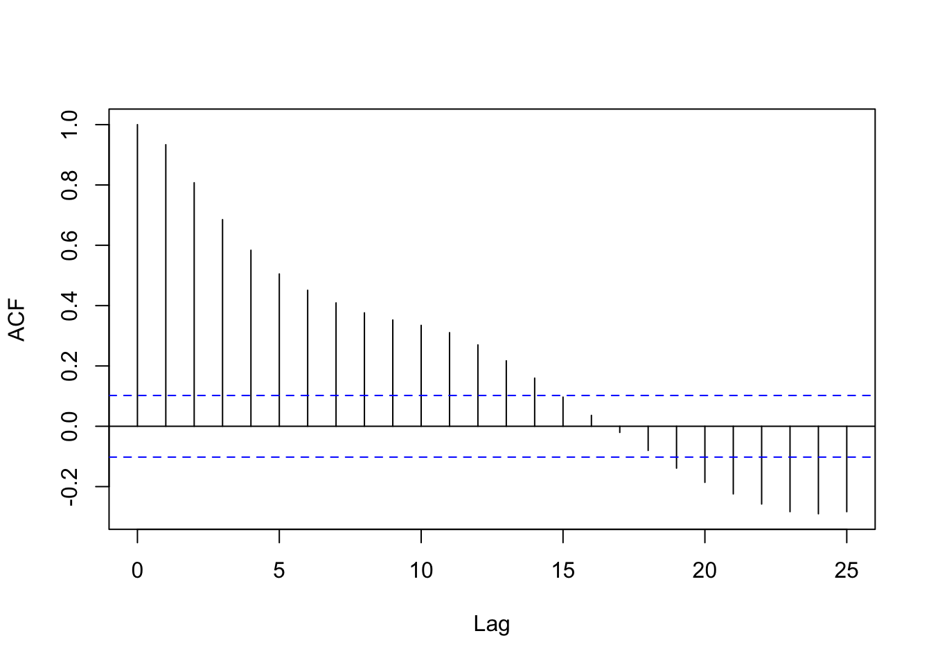 We can capture this pattern succinctly by computing the correlation coefficient at each lag. This is called the (sample) autocorrelation function.